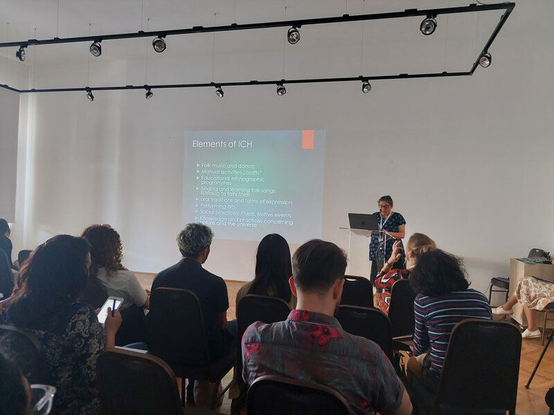 Vervolgens gaf etnografe dr. Eszter Csonka-Takács ons een inzicht in het netwerk voor het borgen van ICH in Hongarije. Daarbij lag de focus op de bottom-up werking en de samenwerking tussen erfgoedgemeenschappen onderling. Zo organiseert het museum thematische forums voor gemeenschappen zodat ze onderling informatie kunnen uitwisselen. Daarnaast zijn er jaarlijks meerdere festivals die doorgaan op het domein van het museum. Op deze gelegenheden krijgen erfgoedgemeenschappen de kans om zichzelf te presenteren aan het grote publiek en samen hun praktijken te vieren.